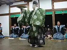 Les premières formes abouties du théâtre japonais, le nô et le kyōgen, émergent des différentes danses et pantomimes religieuses peu à peu incorporées au folklore, donc au monde profane, et réalisées par des troupes qui se professionnalisent et font évoluer leur art[36],[37]. Avant le XIVe siècle, plusieurs formes de spectacles appelés nô cohabitent, souvent joués aussi bien pour les cérémonies religieuses que profanes par des moines ou des troupes professionnelles, comme le sarugaku nô, le dengaku nô, l’ennen nô, le shugen nô[38], etc. La dernière étape avant la formation d’un véritable spectacle dramatique est l’apparition du dialogue. Ce dernier apparaît principalement dans les festivals populaires, les matsuri, où s’instaurent des échanges parlés entre danseurs. Les troupes de sarugaku adaptent notamment des légendes traditionnelles des cérémonies religieuses du Nouvel An en spectacle à plusieurs personnages qui dialoguent ; à l’époque de Kamakura, les troupes de sarugaku jouent ces pièces dans les temples du Japon auprès du peuple[39].