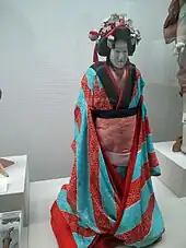 Le ningyō jōruri ou bunraku est souvent décrit comme le théâtre de marionnettes le plus avancé du monde, notamment parce que son raffinement, sa poésie et ses sources littéraires le destinent à un public d’adultes et non d’enfants[168]. Le bunraku associe trois formes artistiques. Premièrement, la manipulation des marionnettes ou poupées, qui mesurent environ d'un mètre à un mètre cinquante, est réalisée par des marionnettistes parfaitement visibles sur la scène, au sein du décor. Deuxièmement, les dialogues, bruits, chants et déclamations poétiques sont assurés par le conteur appelé tayū. Pour les pièces longues, plusieurs tayū se relaient car assurer toutes les voix est éreintant[169]. Enfin, la musique d’accompagnement est jouée au shamisen, et un chœur chante dans certains passages lyriques[170]. Le tayū et le joueur de shamisen sont tous deux visibles au bord de la scène, habillés en costume de l’époque d’Edo[171].