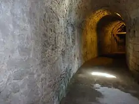 Entre cette zone et la première ligne de gradins, il y a une rangée de pierres de taille qui auraient pu être un mur latéral d'une galerie supérieure.