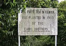 Les premiers théiers sont plantés à Limuru en 1903 par G.W.L. Caine, un colon encouragé par la politique de migration des citoyens britanniques vers le Kenya[1].Il ne cherche pas à exploiter commercialement cette plantation, qui a une visée purement esthétique[1].