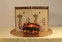 홍삼차 (hongsam cha), chinois 紅蔘茶 (hóng shēn chá). Ce ginseng a longtemps été un monopole coréen[126]. La littérature académique sur cette tisane se concentre sur les applications médicinales (cancer, anémies, anticoagulant[127], photo vieillissement cutané des souris chauves[128], etc.). Les modes de traitement de la racine engendrent des gouts différents des décoctions. Les préférences des consommateurs coréens sont diverses, les uns aiment les thés rouges de ginseng rouge produits avec haute pression hydrostatique et fermentation, les autres la forte saveur de ginseng de la méthode traditionnelle, enfin le goût sucré et à la saveur de jujube des extraits alcooliques trouve l'approbation d'un troisième groupe[129].