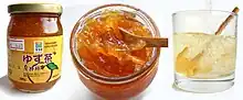 Fleur du yeuzou au Japon - (Styphnolobium japonicum): 괴화차 (goehwa cha), chinois 槐花茶 (huái huā chá), la fleur du sophora du Japon est employée pour les hémorroïdes[62] ou les dartres[63]. Ces fleurs sont connues pour entrer dans la composition du thé de 5 fleurs 五花茶 (wǔ huāchá)[64], boisson rafraichissante chinoise.