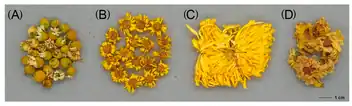 4 types de thés secs de chrysanthème : ( A ) camomille, ( B ) Xiaokuixiang, ( C ) Huangju et ( D ) Hangju[6].