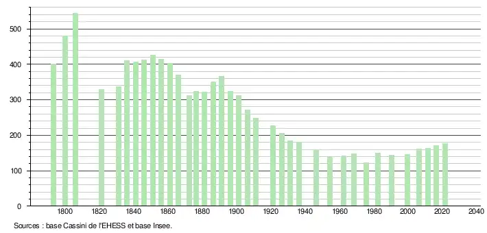 L'évolution du nombre d'habitants est connue à travers les recensements de la population effectués dans la commune depuis 1793. Pour les communes de moins de 10 000 habitants, une enquête de recensement portant sur toute la population est réalisée tous les cinq ans, les populations légales des années intermédiaires étant quant à elles estimées par interpolation ou extrapolation[34]. Pour la commune, le premier recensement exhaustif entrant dans le cadre du nouveau dispositif a été réalisé en 2006[35].