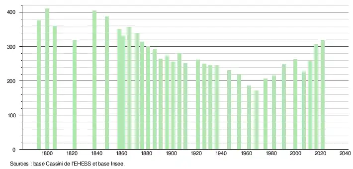 L'évolution du nombre d'habitants est connue à travers les recensements de la population effectués dans la commune depuis 1793. Pour les communes de moins de 10 000 habitants, une enquête de recensement portant sur toute la population est réalisée tous les cinq ans, les populations légales des années intermédiaires étant quant à elles estimées par interpolation ou extrapolation[14]. Pour la commune, le premier recensement exhaustif entrant dans le cadre du nouveau dispositif a été réalisé en 2006[15].