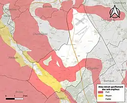 Le retrait-gonflement des sols argileux est susceptible d'engendrer des dommages importants aux bâtiments en cas d’alternance de périodes de sécheresse et de pluie. 46,8 % de la superficie communale est en aléa moyen ou fort (54,2 % au niveau départemental et 48,5 % au niveau national). Sur les 756 bâtiments dénombrés sur la commune en 2019, 569 sont en aléa moyen ou fort, soit 75 %, à comparer aux 57 % au niveau départemental et 54 % au niveau national. Une cartographie de l'exposition du territoire national au retrait gonflement des sols argileux est disponible sur le site du BRGM[14],[Carte 2].