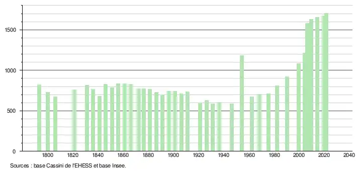 L'évolution du nombre d'habitants est connue à travers les recensements de la population effectués dans la commune depuis 1793. Pour les communes de moins de 10 000 habitants, une enquête de recensement portant sur toute la population est réalisée tous les cinq ans, les populations légales des années intermédiaires étant quant à elles estimées par interpolation ou extrapolation[17]. Pour la commune, le premier recensement exhaustif entrant dans le cadre du nouveau dispositif a été réalisé en 2004[18].