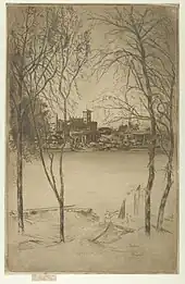 L'une de ses plus grandes gravures, mesurant 35 x 22 cm, est une pointe sèche travaillée entre 1889 et 1898, intitulé Laburnums and Battersea[22].