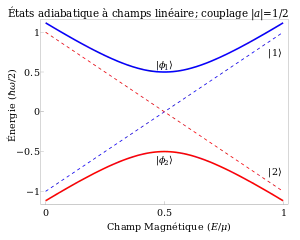 Figure 2. Un croisement évité de niveaux d'énergie dans un système à deux niveaux soumis à un champ magnétique externe. Remarquer que les énergies des états diabatiques et et les valeurs propres de l'hamiltonien, donnant les énergies des états propres et (états adiabatiques).