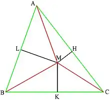Plus précisément, soit ABC un triangle, M un point intérieur à ce triangle, H, K et L les projetés orthogonaux de M respectivement sur (AC), (BC) et (AB). L'inégalité d'Erdős-Mordell s'énonce :
