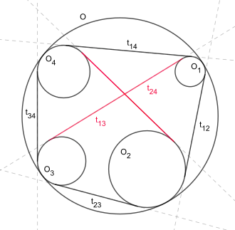 Soit un cercle de rayon . Soient quatre cercles, ne s'intersectant pas, intérieurs à et tangents à , de rayons . Notons la longueur du segment tangent extérieurement commun aux cercles . Alors[1] :
