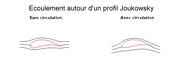 Le schéma ci-après illustre, dans le cas d'un profil Joukowski, la création de la circulation, donc de la portance.