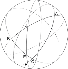 Soit (ABC) un triangle sphérique. Si un grand cercle coupe les grands cercles (AB), (BC) et (CA) respectivement en D, E et F alors