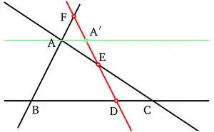Soit A' le point appartenant à la droite (FD) tel que (AA') soit parallèle à (BD). D'après le théorème de Thalès appliqué aux paires de triangles FBD/FAA' et EDC/EA'A, on a respectivement les égalités de rapports de mesures algébriques :