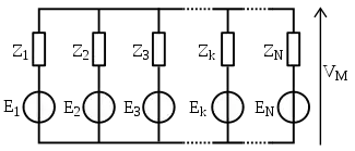 Comme les branches (Zk ; Ek) sont en parallèle, on travaille avec les admittances , ce qui simplifie les calculs. Pour chaque branche (source de tension et impédance), on obtient, d'après la loi d'ohm : (chaque courant est ainsi orienté vers le haut ; vers le point M)