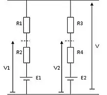 Autre exemple: Il n'est pas nécessaire que les sources de tension soient parfaites, celles-ci peuvent inclure des résistances même de forte valeur.