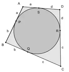 Pour le démontrer, il suffit de décomposer ces quatre longueurs, selon les points de contact, en huit longueurs égales deux à deux [3]. Pitot démontra la propriété analogue pour un polygone circonscriptible à un nombre pair de sommets, et l'étendit à un nombre impair de sommets.