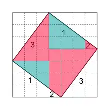 Pour un triangle rectangle donné, il est possible de l’inscrire en quatre exemplaires dans les coins d’un carré dont le côté a pour longueur la somme des longueurs des côtés de l'angle droit. Les quatre hypoténuses forment alors un carré, par égalité de longueur et sachant que chacun de ses angles est supplémentaire des deux angles aigus du triangle.