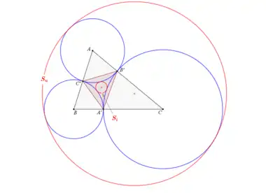 avec R le rayon du cercle circonscrit, r le rayon du cercle inscrit, s le semi-périmètre du triangle formé par les centres des trois premiers cercles, et Δ, son aire.