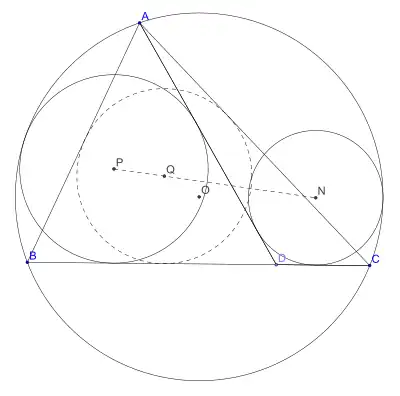 Théorème de Sawayama-Thébault — Soient ABC un triangle quelconque, et D un point de [BC]. Soient Q le centre du cercle inscrit au triangle ABC, de rayon r, et le cercle circonscrit au triangle ABC. Soient N le centre du cercle tangent à [DC], [DA] et , de rayon r1, et P le centre du cercle tangent à [DB], [DA] et , de rayon r2. On note .