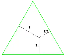 Soient un triangle équilatéral de côté a et P un point intérieur à ce triangle. On note h la longueur commune des hauteurs du triangle, et l, m et n les distances de P aux côtés du triangle, respectivement [AB], [AC] et [BC].