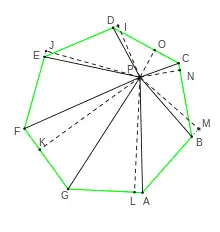 Cette propriété utilise le même argument que précédemment. Si P est à l'intérieur du polygone A1...An, les segments PA1, ...PAn découpent le polygone en n triangles de bases A1A2, A2A3, ..., AnA1. L'aire du polygone est alors égale à la somme des aires de chaque triangle. Les triangles ayant des bases de même taille (la taille d'un côté), la somme des aires est égale au produit de la somme des hauteurs par un demi-côté. L'aire du polygone et la longueur d'un demi côté étant indépendants de P, la somme des hauteurs est aussi indépendante de P. On peut évaluer alors cette somme à n fois l'apothème (la distance séparant le centre du polygone d'un côté).