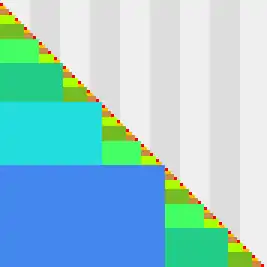 | Représentation de Zeckendorf des 89 premiers entiers. Les largeurs des rectangles sont des nombres de Fibonacci Fi, alors que les hauteurs correspondantes ont Fi-1. Les rectangles de la mème couleur sont congruents. |