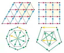 Considérons une ligne du réseau sur laquelle les nœuds sont séparés par le vecteur de translation a. En appliquant une opération de symétrie rotationnelle R d'ordre n (d'angle θ = 360°/n) sur cette ligne, on obtient une ligne de points (en vert sur la figure) séparés par la distance a ; ceci est aussi valable en appliquant l'opération inverse R–1 d'angle –θ (points orange).