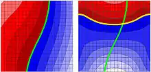 Un « raisonnement » intuitif incite à penser que l'existence d'un tel point est plausible : la fonction g1 est une fonction de [–1, 1]×[–1, 1] dans R. Elle peut s'interpréter comme une carte d'une région, qui en chaque point donne l'altitude (illustrée sur la première figure à droite). Sur la zone {–1}×[–1, 1], cette altitude est positive (en rouge sur la figure), en revanche sur {1}×[–1, 1], elle est négative (en bleu sur la figure). Ceci « laisse penser que » la « courbe » de niveau 0 est une ligne (en vert sur la figure) qui part d'un point [–1, 1]×{1} pour finir sur un point de [–1, 1]×{–1}, mais cette intuition est fausse : la zone verte n'est pas nécessairement une ligne ni même une partie connexe. Le même « raisonnement » appliqué à g2 « laisse penser que » la courbe de niveau 0 serait cette fois-ci une ligne partant d'un point de {–1}×[–1, 1] pour terminer sur un point de {1}×[–1, 1] (illustré sur la deuxième figure, la ligne est en jaune).