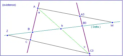 Ici l'existence est explicitée uniquement pour le cas où 4 couples sont faits de points distincts, à savoir B3, B ; C3, C ; A3, A et C3, A. Soient Delta la droite B-B3, Z = Delta ∩ C-C3, W = Delta ∩ A-A3, b = Delta ∩ A-C3. D'abord précisons que ces droites et ces points existent toujours à cause des axiomes du plan projectif d'incidence rappelés supra. Les points auxiliaires a et c sont en fait confondus avec A et C3. On considère 2 transformations projectives unidimensionnelles :