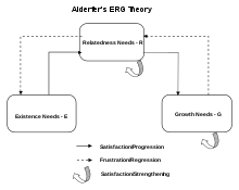 Alderfer a également proposé une théorie de la progression et de la régression pour accompagner sa théorie : il a déclaré que lorsque les besoins d'une catégorie inférieure sont satisfaits, un individu investira plus d'efforts dans la catégorie supérieure (exemple : Si la personne est en mesure de se loger et de se nourrir, elle seras plus encline à développer ses relations inter-personnelles), et lorsque les besoins d'une catégorie supérieure sont frustrés, un l'individu investira plus d'efforts dans la catégorie inférieure (exemple : si la personne à des difficultés dans ses relations avec les autres, elle se repliera sur ses besoins primaires).