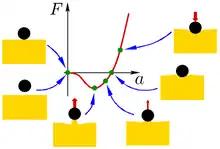 Lors de la compression, en augmentant la force appliquée (), la région de contact s'élargit progressivement (points situés au-dessus de l'axe horizontal de la courbe). Lors de la décompression, on repasse par les mêmes états jusqu'au point de force nulle.