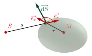 La formule de diffraction de Fresnel-Kirchhoff[1] fournit l'expression de l'amplitude de la perturbation en un point causée par une source ponctuelle en un point émettant un rayonnement monochromatique isotrope, à la seule condition que la longueur d'onde soit négligeable devant les distances de propagation :