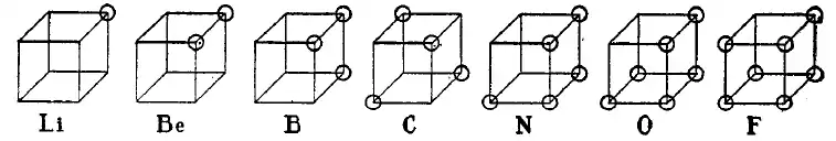 La théorie de l'atome cubique fut un des premiers modèles atomiques dans lequel les électrons étaient positionnés aux huit sommets d'un cube pour un atome ou une molécule non polaire. Cette théorie fut développée en 1902 par Gilbert N. Lewis et publiée en 1916 dans le célèbre article The Atom and the Molecule puis utilisée pour la description du phénomène de valence. La base de cette théorie fut structurée à partir de la loi d'Abegg. Elle fut complétée en 1919 par Irving Langmuir sous l'appellation de modèle d'atome à octet cubique. La figure ci-dessous montre les structures des éléments de la seconde période de la classification selon ce modèle d'atome cubique.