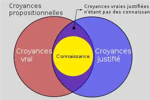Un diagramme d'Euler représentant une version de la définition traditionnelle de la connaissance adaptée au problème de Gettier. Ce problème nous donne des raisons de penser que toutes les croyances vraies justifiées ne constituent pas une connaissance.