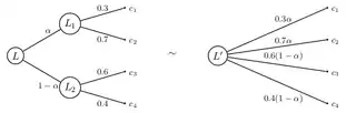 Cette propriété de mixage peut être vue comme une composition de loterie[30]. La loterie correspond à la loterie à deux étapes qui, dans un premier temps, offre les loteries et avec les probabilités et respectivement et, à la seconde étape, offre la conséquence . Cet axiome considère comme équivalent la loterie composée (à plusieurs étapes) et sa forme réduite (à une étape).