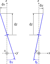 La fibre normale en (x, y) tourne d'un angle θx autour de l'axe x et d'un angle θy autour de l'axe y. Comme on est en petite déformation, l'arc de cercle décrit par un point lors de la rotation de la fibre normale est assimilable à un segment de droite, et l'on a :