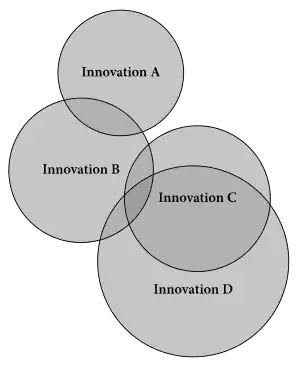Ce diagramme d'Euler doit se lire comme une carte géographique, ou plus précisément dialectologique. Chaque cercle représente une innovation linguistique, comme des isoglosses sur une carte dialectale. À mesure qu'une innovation se répand dans le continuum dialectal, les cercles augmentent de diamètre au fil du temps, comme des “ondes” ou “vagues” sur la surface de l'eau frappée par une pierre. Les langues modernes résultent de l'accumulation, au fil du temps, des innovations linguistiques représentées par ces cercles; par ex. dans ce schéma, une petite zone reflétera les innovations B, C et D. Les zones non recouvertes par des cercles sont les aires conservatrices, caractérisées par moins d'innovations depuis la langue ancestrale.