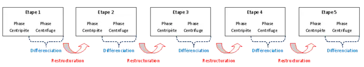 Ces processus sont appliqués à deux niveaux. Le premier est inter-étape (Cf. schéma ci-contre), c'est-à-dire qu'en simplifiant l'on peut dire que les stades centrifuges de Wallon peuvent être assimilés à un processus de différenciation particulier, tandis que les stades centripètes à un processus de restructuration.