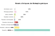 Le concept de thérapie génique est né de l'idée de traiter des pathologies héréditaires. Il s'est rapidement orienté vers le traitement de toutes les affections, héréditaires ou non, dans lesquelles il était possible d'imaginer que certains gènes étaient défectueux ou qu'il était possible d'envisager un rôle pour de nouveaux gènes. Les cancers, les infections virales, la douleur, les affections cardiaques, les atteintes traumatiques du système nerveux… Conceptuellement, il n'est pas une pathologie qui ne pourrait pas bénéficier d'une approche de thérapie génique, que ce soit par une stratégie de restauration d'une activité génétique défaillante ou par la production d'une activité supplémentaire qui puisse avoir un impact thérapeutique. En 2013, près de 2 000 essais cliniques auraient été proposés au niveau international[réf. nécessaire],[23]. L'analyse cumulée des données montre que, depuis le premier essai clinique (qui s'intéressait alors au traitement du cancer), environ 65 % des essais se focalisent sur le traitement du cancer, et 35% sur des pathologies très variables comme les infections virales, les maladies neurologiques, les pathologies oculaires, les maladies liées à des déficiences au niveau du système sanguin... Si le jeu des statistiques est tentant, il faut toutefois se garder de tirer des conclusions claires de l'analyse globale de ces protocoles qui s'intéressent à des pathologies, des technologies et des concepts très diversifiés. De plus, le peu de données exhaustives qu'il est possible d'obtenir pour ces protocoles rend difficile l'estimation du nombre réel de protocoles cliniques effectivement réalisés, du nombre de patients, du niveau de divulgation des résultats du protocole dans des journaux scientifiques, voire du réel intérêt thérapeutique des protocoles réalisés.
