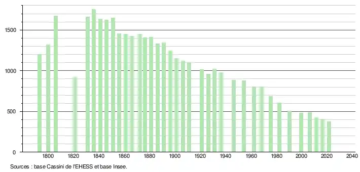 L'évolution du nombre d'habitants est connue à travers les recensements de la population effectués dans la commune depuis 1793. Pour les communes de moins de 10 000 habitants, une enquête de recensement portant sur toute la population est réalisée tous les cinq ans, les populations légales des années intermédiaires étant quant à elles estimées par interpolation ou extrapolation[17]. Pour la commune, le premier recensement exhaustif entrant dans le cadre du nouveau dispositif a été réalisé en 2006[18].