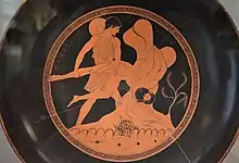 - Thésée et Athéna, Athéna conduit Thésée auprès d'Amphitrite, coupe attique à figures rouge du potier Euphronios et du peintre Onésimos, vers 500-490 avant J.-C. Musée du Louvre, Paris