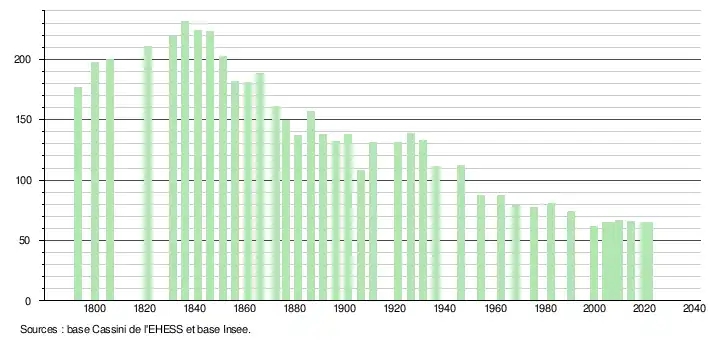 L'évolution du nombre d'habitants est connue à travers les recensements de la population effectués dans la commune depuis 1793. Pour les communes de moins de 10 000 habitants, une enquête de recensement portant sur toute la population est réalisée tous les cinq ans, les populations légales des années intermédiaires étant quant à elles estimées par interpolation ou extrapolation[14]. Pour la commune, le premier recensement exhaustif entrant dans le cadre du nouveau dispositif a été réalisé en 2004[15].