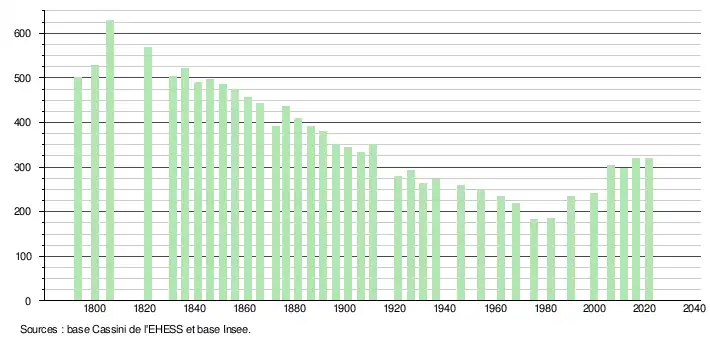 L'évolution du nombre d'habitants est connue à travers les recensements de la population effectués dans la commune depuis 1793. Pour les communes de moins de 10 000 habitants, une enquête de recensement portant sur toute la population est réalisée tous les cinq ans, les populations légales des années intermédiaires étant quant à elles estimées par interpolation ou extrapolation[29]. Pour la commune, le premier recensement exhaustif entrant dans le cadre du nouveau dispositif a été réalisé en 2006[30].