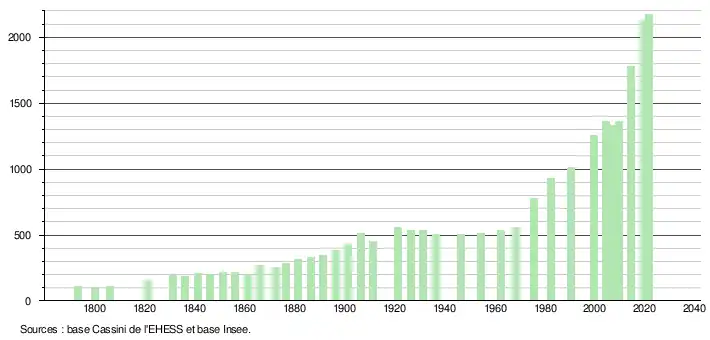 L'évolution du nombre d'habitants est connue à travers les recensements de la population effectués dans la commune depuis 1793. Pour les communes de moins de 10 000 habitants, une enquête de recensement portant sur toute la population est réalisée tous les cinq ans, les populations légales des années intermédiaires étant quant à elles estimées par interpolation ou extrapolation[33]. Pour la commune, le premier recensement exhaustif entrant dans le cadre du nouveau dispositif a été réalisé en 2004[34].