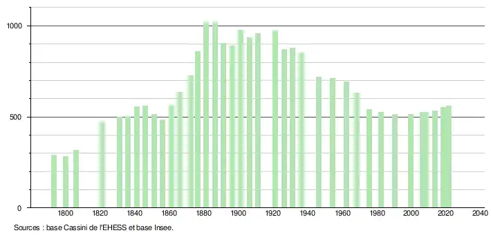 L'évolution du nombre d'habitants est connue à travers les recensements de la population effectués dans la commune depuis 1793. Pour les communes de moins de 10 000 habitants, une enquête de recensement portant sur toute la population est réalisée tous les cinq ans, les populations légales des années intermédiaires étant quant à elles estimées par interpolation ou extrapolation[29]. Pour la commune, le premier recensement exhaustif entrant dans le cadre du nouveau dispositif a été réalisé en 2008[30].