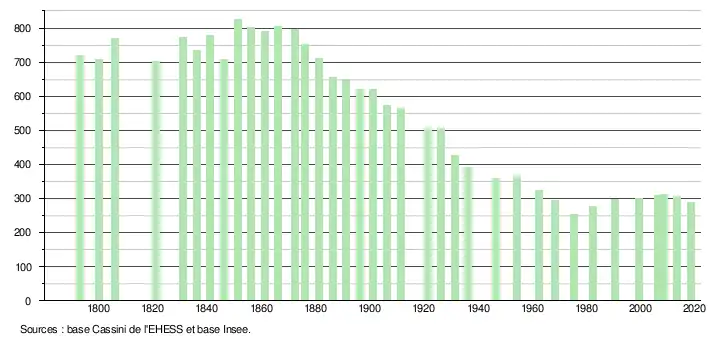 L'évolution du nombre d'habitants est connue à travers les recensements de la population effectués dans la commune depuis 1793. Pour les communes de moins de 10 000 habitants, une enquête de recensement portant sur toute la population est réalisée tous les cinq ans, les populations légales des années intermédiaires étant quant à elles estimées par interpolation ou extrapolation[4]. Pour la commune, le premier recensement exhaustif entrant dans le cadre du nouveau dispositif a été réalisé en 2008[5].