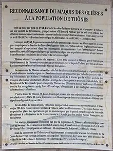 - Le , Le Progrès se fait l'écho de cet événement : « Thônes est aujourd'hui en liesse, parée de ses plus beaux atours ; des drapeaux ornent à profusion les maisons que domine le vieux clocher ; le vent agite les emblèmes américains et anglais, les mêmes qui furent audacieusement accrochés un certain soir où sévissait l'occupation. Tout à côté se détache une oriflamme tricolore sur laquelle s'inscrit dans un V la croix de Lorraine et qui fut également hissée pendant l'Occupation. (...) Le général Doyen s'avance au milieu de la place ; cependant que le commandant Chellandon donne lecture de la citation décernée à l'héroïque cité, le général épingle la Médaille de la Résistance sur un coussin brodé aux armes de la Ville, que lui présente le maire, M. Haase. » [lire en ligne]