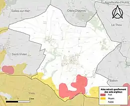 Le retrait-gonflement des sols argileux est susceptible d'engendrer des dommages importants aux bâtiments en cas d’alternance de périodes de sécheresse et de pluie. 14,1 % de la superficie communale est en aléa moyen ou fort (54,2 % au niveau départemental et 48,5 % au niveau national). Sur les 791 bâtiments dénombrés sur la commune en 2019, 8 sont en aléa moyen ou fort, soit 1 %, à comparer aux 57 % au niveau départemental et 54 % au niveau national. Une cartographie de l'exposition du territoire national au retrait gonflement des sols argileux est disponible sur le site du BRGM[13],[Carte 2].