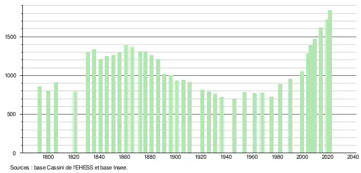 L'évolution du nombre d'habitants est connue à travers les recensements de la population effectués dans la commune depuis 1793. Pour les communes de moins de 10 000 habitants, une enquête de recensement portant sur toute la population est réalisée tous les cinq ans, les populations légales des années intermédiaires étant quant à elles estimées par interpolation ou extrapolation[16]. Pour la commune, le premier recensement exhaustif entrant dans le cadre du nouveau dispositif a été réalisé en 2004[17].